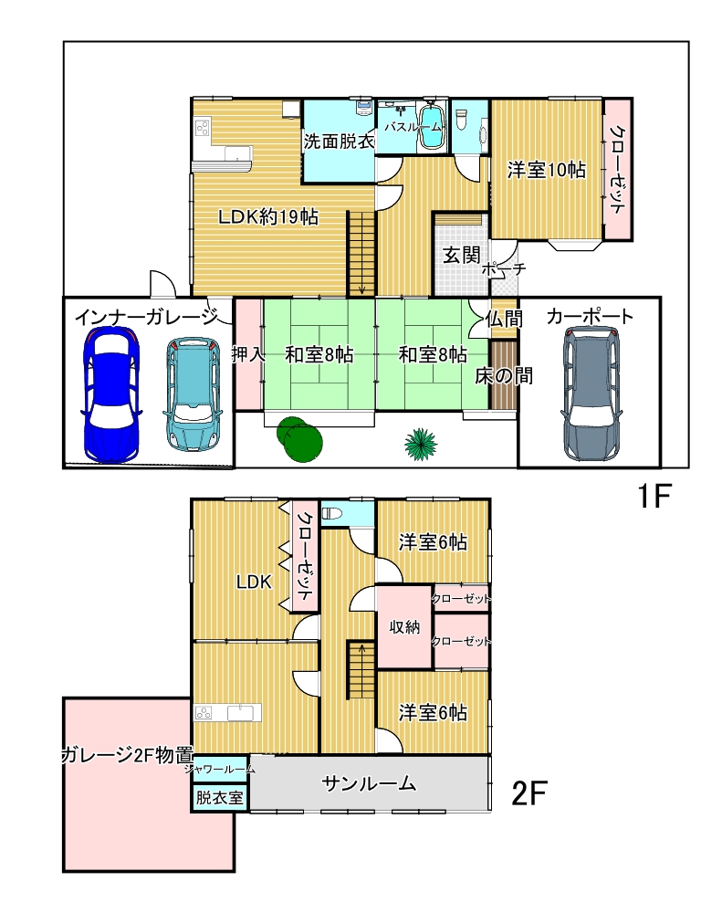 1F LDK約19帖、洋室10帖、和室8帖×2室 2F LDK約14帖、洋室6帖×2室、納戸、サンルーム |